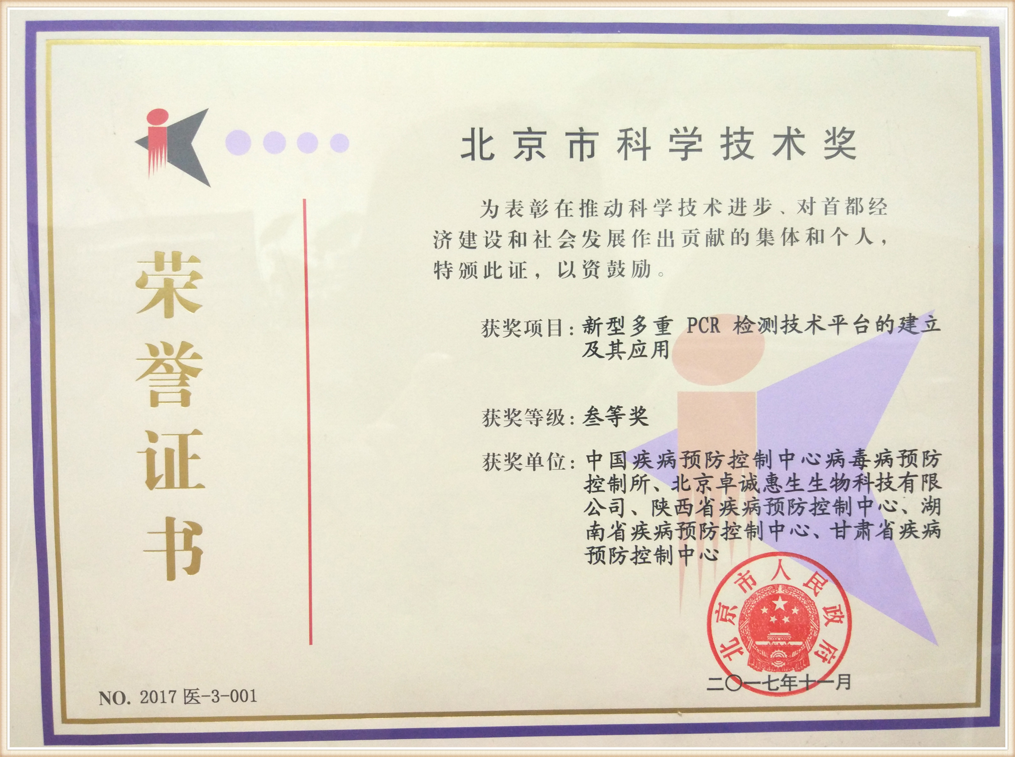 為表彰在2017年推動(dòng)科學(xué)技術(shù)進(jìn)步,對(duì)首都經(jīng)濟(jì)建設(shè)和社會(huì)發(fā)展作出貢獻(xiàn)的集體和個(gè)人,北京市人民政府于2017年11月為北京卓誠(chéng)惠生參與完成的“新型多重PCR檢測(cè)技術(shù)平臺(tái)的建立及其應(yīng)用”項(xiàng)目頒發(fā)北京市科學(xué)技術(shù)獎(jiǎng)叁等獎(jiǎng),以資鼓勵(lì)。