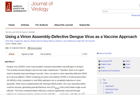 登革熱病毒(DENV)目前流行性最廣的通過(guò)蚊蟲傳播的病毒。登革熱病毒感染后可導(dǎo)致患者高熱,頭痛,肌肉、骨關(guān)節(jié)劇烈酸痛、部分患者出現(xiàn)皮疹、出血傾向、淋巴結(jié)腫大。該病毒主要在熱帶和亞熱帶地區(qū)流行,我國(guó)廣東、香港、澳門等地是登革熱流行區(qū)。目前,該病毒還沒(méi)有有效的商品化疫苗來(lái)預(yù)防。近日,來(lái)自武漢病毒研究所的科學(xué)家和美國(guó)的科學(xué)家合作,開發(fā)出了一種新的制備登革熱病毒疫苗毒株的方法,該研究成果目前已發(fā)表至《Journal of Virology》雜志,題為“Using a Virion Assembly-Defective Dengue Virus as a Vaccine Approach”。
