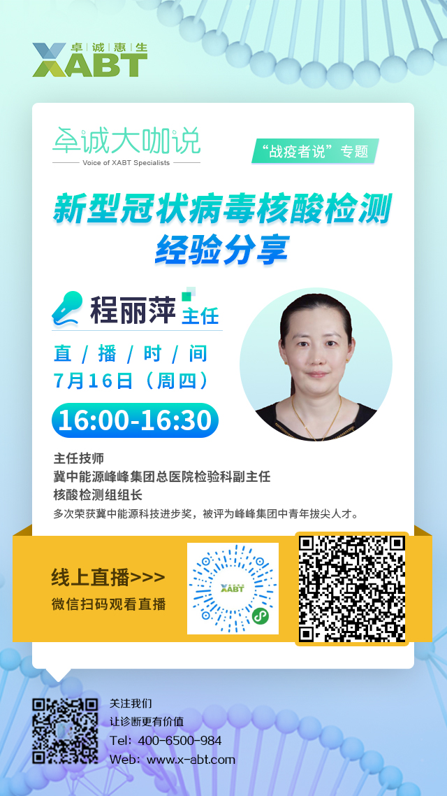 卓誠大咖說之“戰(zhàn)疫者說”專題第三期將于7月16日16:00正式開播,我們非常榮幸邀請到冀中能源峰峰集團(tuán)總醫(yī)院檢驗(yàn)科程麗萍主任為我們帶來《新型冠狀病毒核酸檢測的經(jīng)驗(yàn)分享》的主題講座,期待各位屆時(shí)蒞臨直播間,共同學(xué)習(xí),互相啟發(fā)!