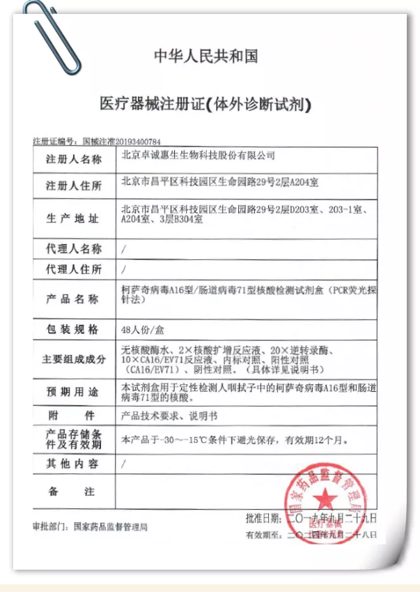 北京卓誠惠生生物科技股份有限公司研發(fā)的柯薩奇病毒A16型 腸道病毒71型核酸檢測試劑盒(PCR熒光探針法)正式獲得醫(yī)療器械注冊證,隆重上市!