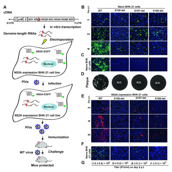研究人員已改造后的DENV毒株為新疫苗開發(fā)平臺(tái),通過(guò)使用反向互補(bǔ)補(bǔ)充方法,將DENV野毒株的非結(jié)構(gòu)蛋白2A(NS2A)整合進(jìn)候選疫苗株內(nèi),拯救出弱感染力的DENV毒株-PIV?NS2A。對(duì)PIV?NS2A進(jìn)行培養(yǎng)發(fā)現(xiàn),其細(xì)胞感染率能達(dá)到107?IFU/ml,通過(guò)免疫小鼠發(fā)現(xiàn),PIV?NS2A能夠刺激機(jī)體T細(xì)胞免疫反應(yīng)及產(chǎn)生高效價(jià)的中和抗體,抵抗DENV野毒株的感染。