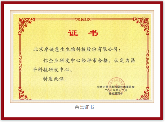 2018年12月,北京市昌平區(qū)科學(xué)技術(shù)委員會(huì)認(rèn)定北京卓誠(chéng)惠生生物科技股份有限公司研發(fā)中心為昌平科技研發(fā)中心,并頒發(fā)榮譽(yù)證書(shū),熱烈祝賀?。?!