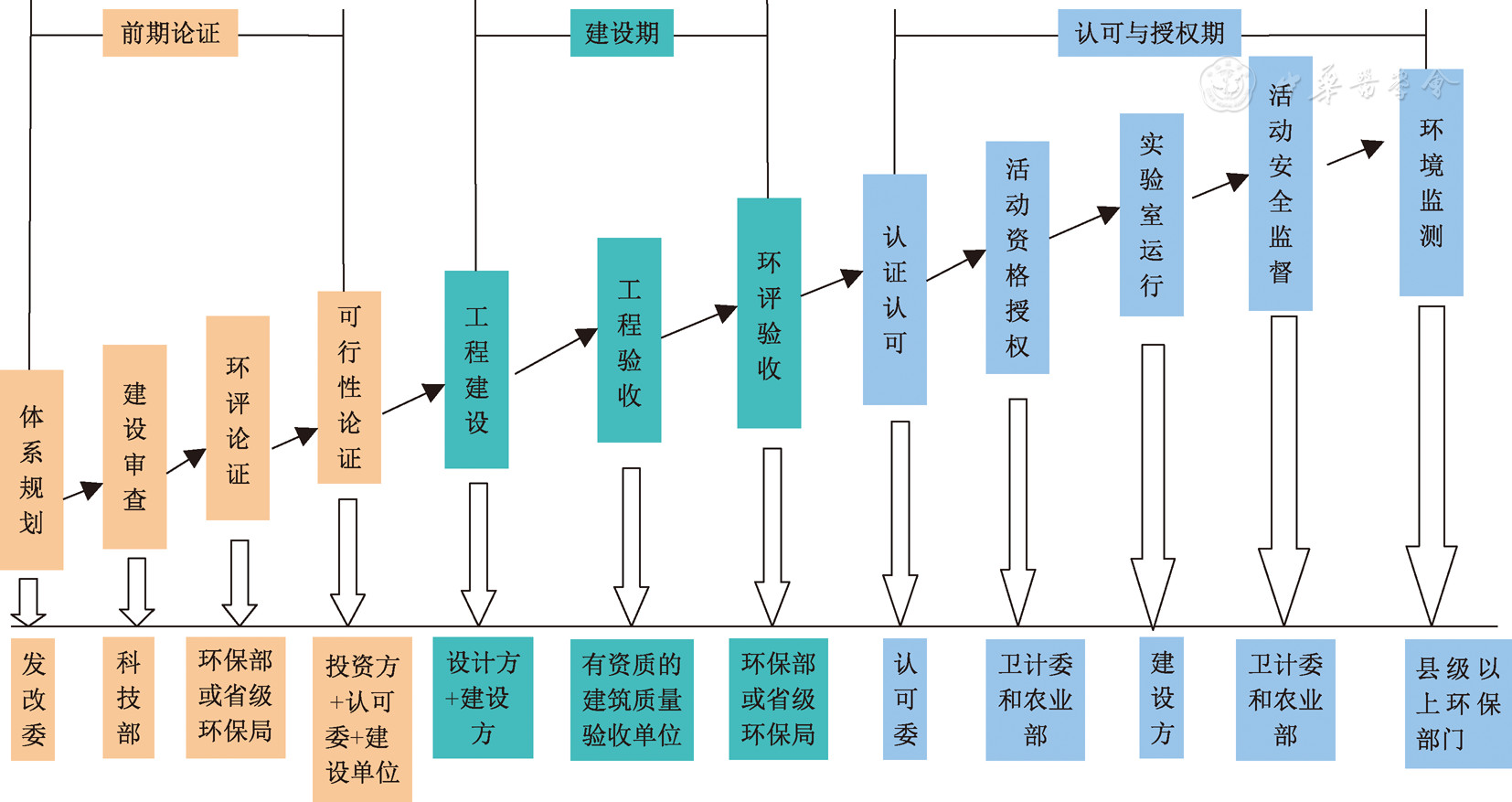 2003年中國暴發(fā)SARS疫情后,中國生物安全實(shí)驗(yàn)室建設(shè)得到極大發(fā)展,成為開展高致病性微生物研究、生物反恐、應(yīng)急處理生物危害事件的關(guān)鍵技術(shù)支撐平臺(tái)。但隨著病原微生物相關(guān)研究的快速增加,許多實(shí)驗(yàn)室的生物安全隱患開始凸顯,生物安全事故時(shí)有發(fā)生,特別是2004年中國發(fā)生實(shí)驗(yàn)室感染SARS病毒事件,并造成了人員和社會(huì)經(jīng)濟(jì)嚴(yán)重?fù)p失,引起中國政府對(duì)實(shí)驗(yàn)室生物安全的高度重視。為了加強(qiáng)實(shí)驗(yàn)室生物安全管理,保護(hù)工作人員和公眾的健康,國務(wù)院于2004年頒布了《病原微生物實(shí)驗(yàn)室生物安全管理?xiàng)l例》(國務(wù)院第424號(hào)令),這是中國第一部針對(duì)生物安全實(shí)驗(yàn)室生物安全的法律。條例規(guī)定了各部門在實(shí)驗(yàn)室建設(shè)管理中的職責(zé)。需要強(qiáng)調(diào)兩點(diǎn):一是在體系規(guī)劃環(huán)節(jié),2016年11月國家發(fā)展改革委(發(fā)改委)、科技部發(fā)布了《高級(jí)別生物安全實(shí)驗(yàn)室體系建設(shè)規(guī)劃(2016-2025年)》,新規(guī)劃明確了新增實(shí)驗(yàn)室建設(shè)不再局限于2004年發(fā)布的《國家高級(jí)別生物安全實(shí)驗(yàn)室體系建設(shè)規(guī)劃》中列出的實(shí)驗(yàn)室名錄;二是在活動(dòng)資格授權(quán)和活動(dòng)安全監(jiān)督環(huán)節(jié),2017年9月國務(wù)院發(fā)布《國務(wù)院關(guān)于取消一批行政許可事項(xiàng)的決定》,衛(wèi)生計(jì)生委和農(nóng)業(yè)部由"行政審批"改為"備案管理"。詳見圖1。
