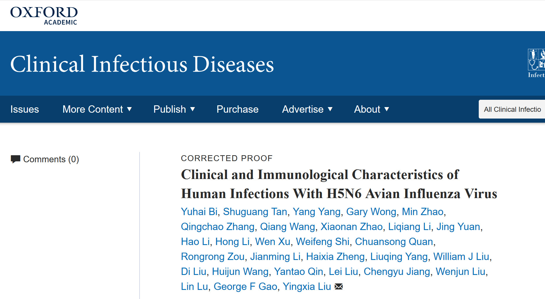 1.Yuhai Bi Shuguang TanYang Yang Gary Wong Min Zhao Qingchao Zhang Qiang Wang Xiaonan Zhao Liqiang LiJing Yuan Hao Li Hong Li Wen Xu Weifeng Shi Chuansong Quan Rongrong ZouJianming Li Haixia Zheng Liuqing Yang William J Liu Di Liu Huijun Wang YantaoQin Lei Liu Chengyu Jiang Wenjun Liu Lin Lu George F Gao Yingxia Liu. Clinicaland Immunological Characteristics of Human Infections With H5N6 Avian InfluenzaVirus. Clinical Infectious Diseases, ciy681