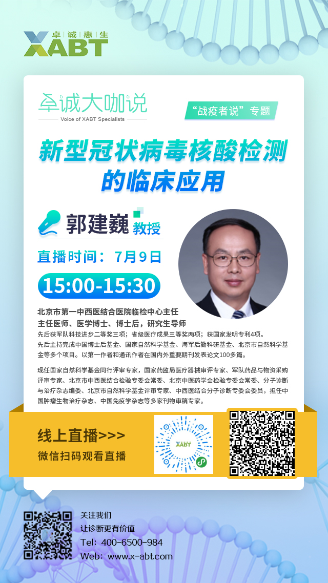 卓誠大咖說之“戰(zhàn)疫者說”專題第二期將于7月9日15:00正式開播,我們非常榮幸邀請到北京市第一中西醫(yī)結(jié)合醫(yī)院臨檢中心郭建巍教授為我們帶來《新型冠狀病毒核酸檢測的臨床應(yīng)用》的主題講座,期待各位屆時蒞臨直播間,共同學(xué)習(xí),互相啟發(fā)!