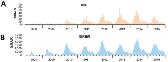來(lái)自29個(gè)省份的數(shù)據(jù)表明,2008-2015年間共計(jì)12,256,102人次手足口病例上報(bào)至國(guó)家疾病預(yù)防和控制中心。如圖1所示,復(fù)發(fā)性手足口病一年中有兩個(gè)高峰,分別是春末夏初(4-6月) 和秋季(9-10月)。