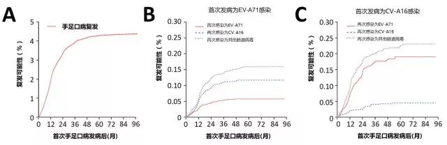 A)所有疑似和確診手足口病患者復(fù)發(fā)的可能性。B)首次感染為EV-A71病毒的患者再次感染的可能性。C) 首次感染為CV-A16病毒的患者再次感染的可能性。